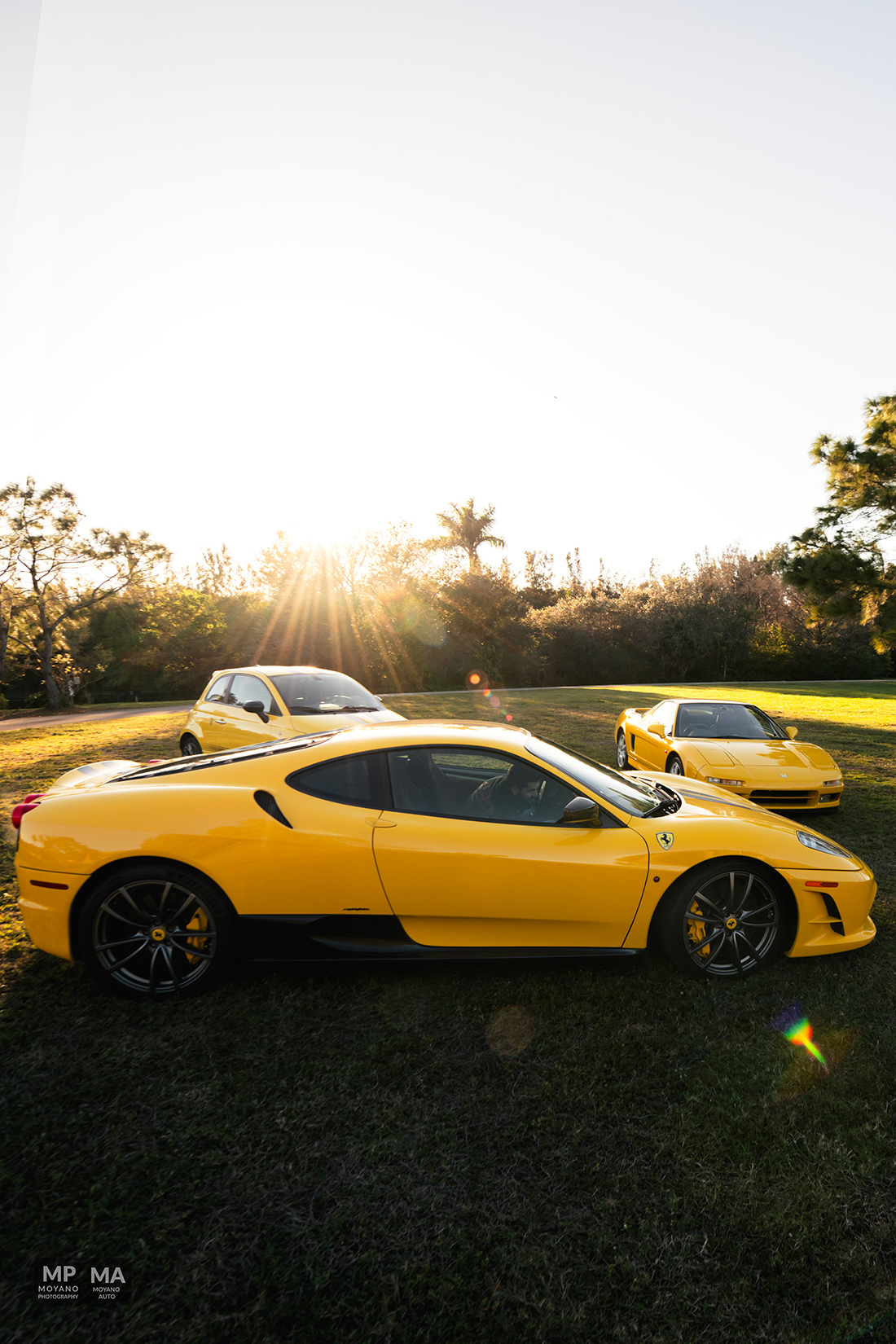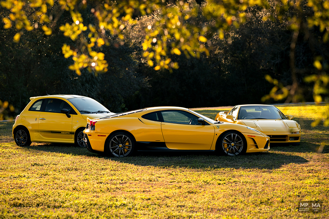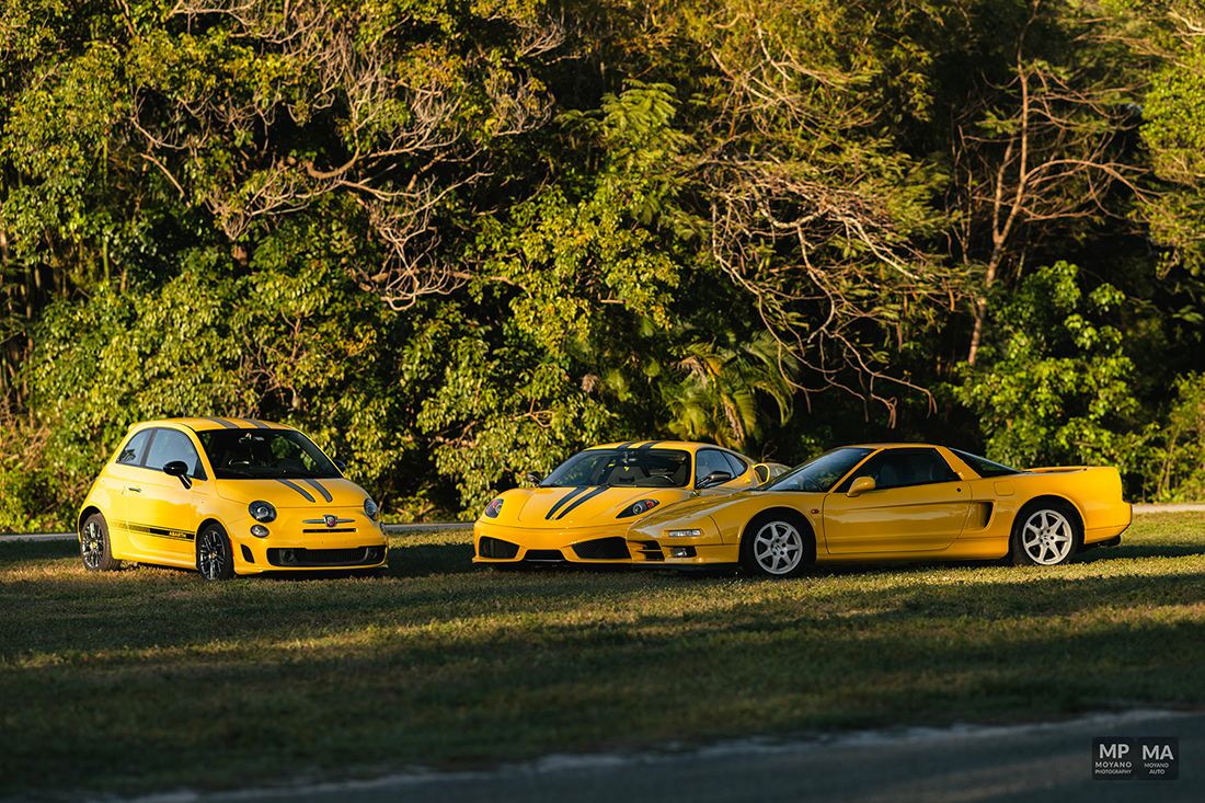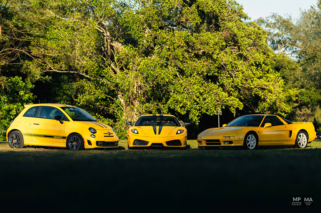 This was a such beautiful sunset! Not everyday we have the HONOR to photograph some pretty awesome and historical cars such these! We have here an epic orange sunset with the trees and a 430 Scuderia!! A Fiat 500 Abarth (Giallo Modena), Honda NSX (Indy Yellow Pearl) … it was quite the spectacle and the park stopped to watch us shoot!