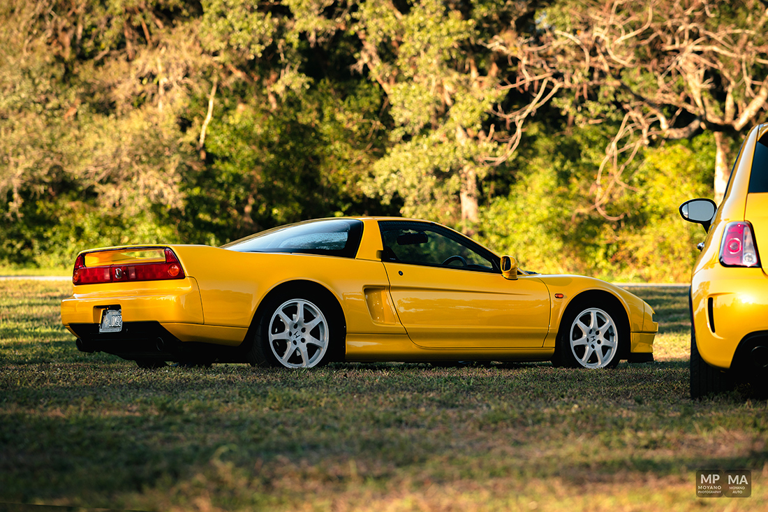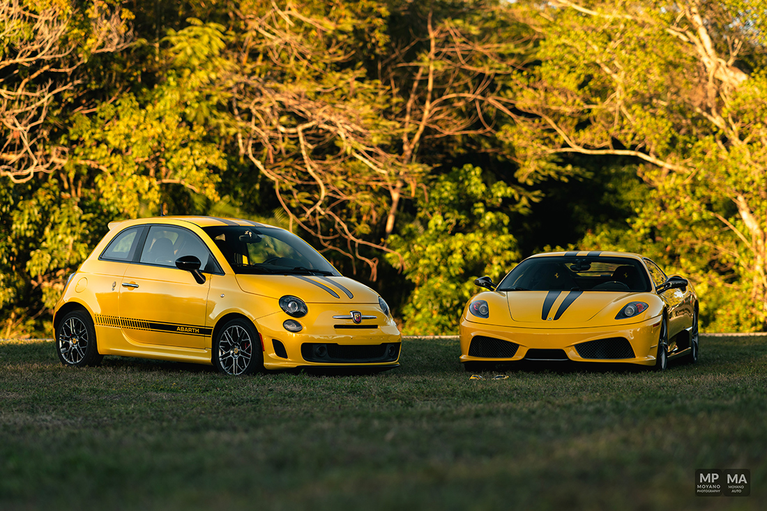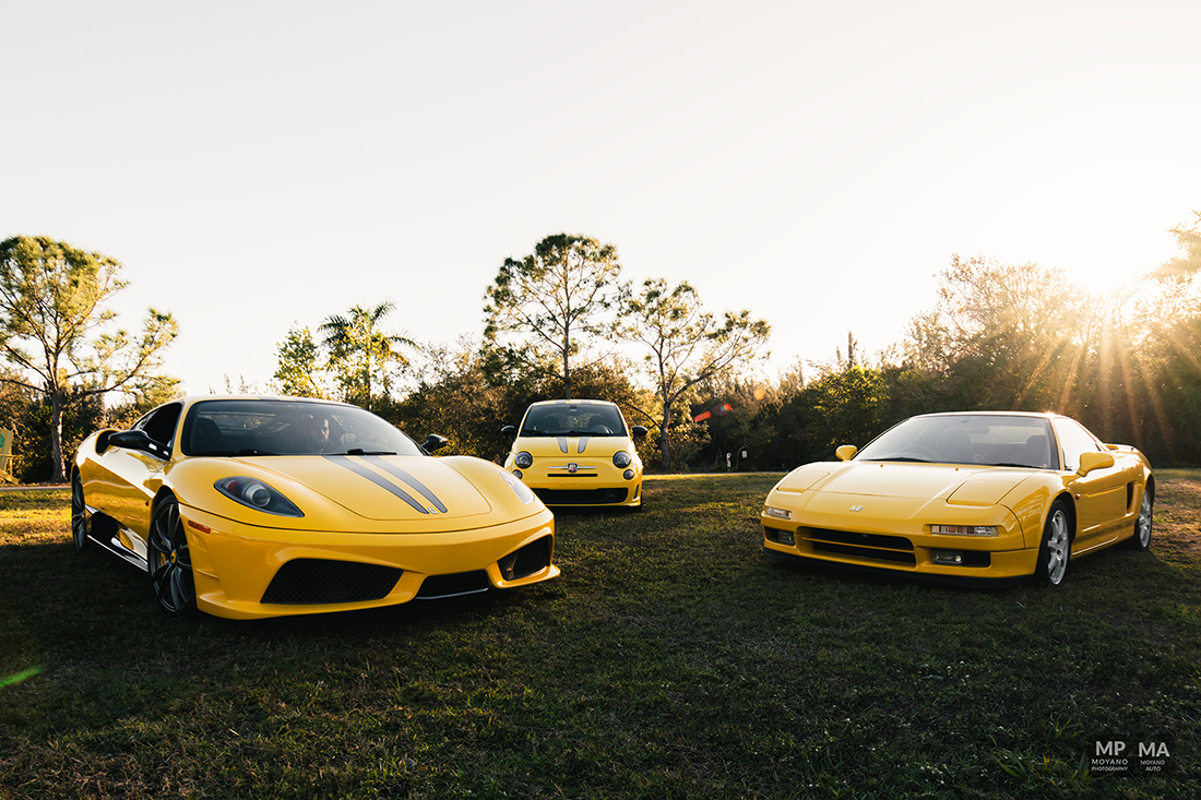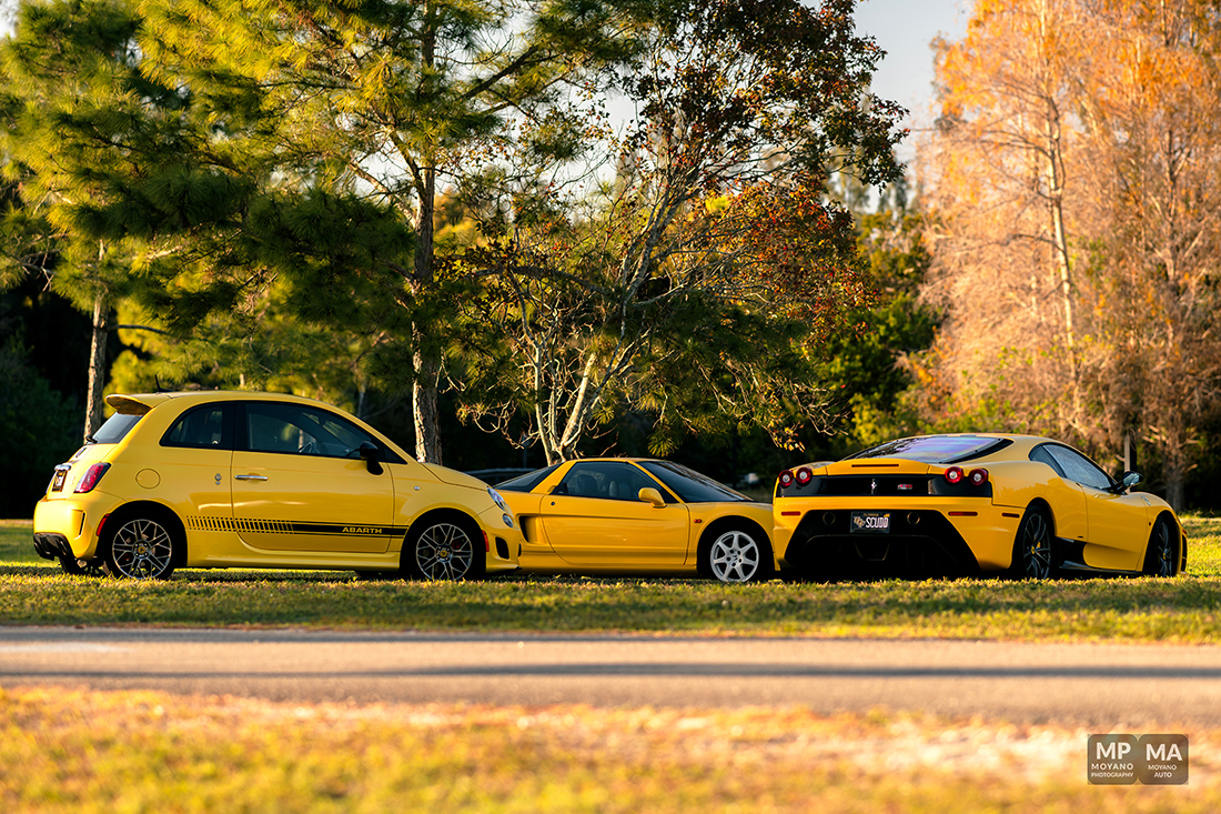 This was a such beautiful sunset! Not everyday we have the HONOR to photograph some pretty awesome and historical cars such these! We have here an epic orange sunset with the trees and a 430 Scuderia!! A Fiat 500 Abarth (Giallo Modena), Honda NSX (Indy Yellow Pearl) … it was quite the spectacle and the park stopped to watch us shoot!